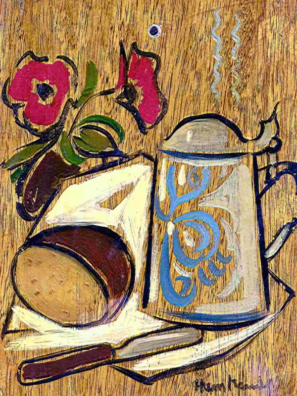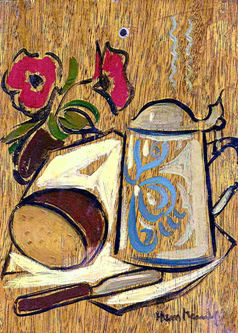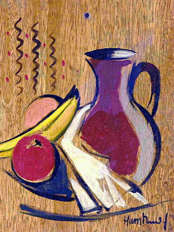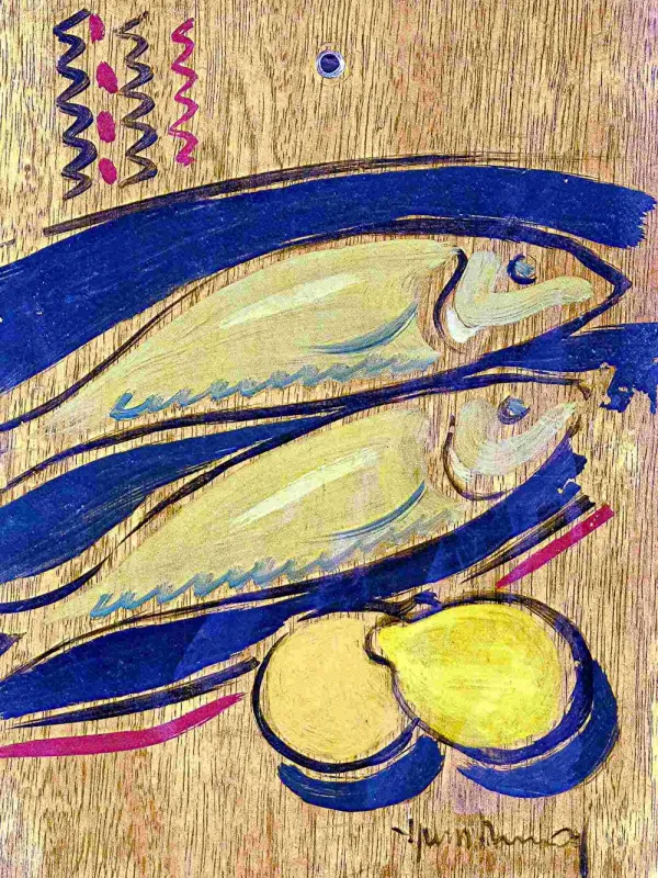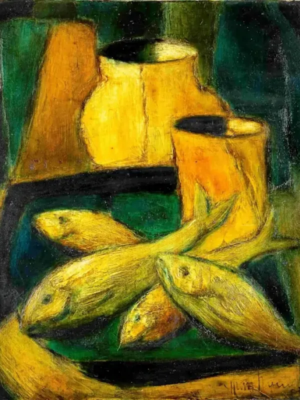 Krüge und Fische, um 1970. Oe.a.L.-H 60x B50cm. Sammlung Weich-Foto Justynowicz