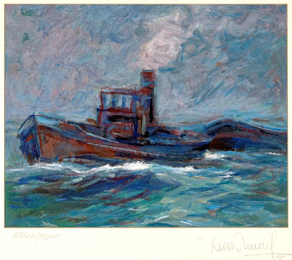 Elbschlepper, um 1985. Öl auf Karton – H 37 x B 48 cm -Sammlung Weich – Foto Justynowicz